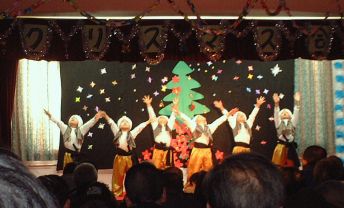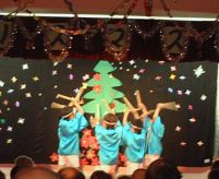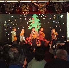 | 成木台病院 12月9日 すっかりクリスマスムードで、舞台も職員の方々の手作り、サンタさん、トナカイさん、お猿さんに天使さんたち そして、大勢の人たちの熱気いっぱいの会場に子供たちもビックリでした。お遊戯で訪問することは初めてでしたので みなさんビックリ大喜びしてくださいました。サンタさんからプレゼントを頂いてしまいました。 |
