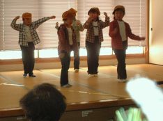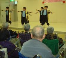 | 飯能リハビリ館 12月9日 成木台病院を後に、保育園のバスに乗って、埼玉県に入りました。 この施設でもお遊戯での訪問は初めてです。 ディサービスなので、見てくださる方は少なかったのですが、保育園の地元の方もいらっしゃいます。 皆さんとってもお元気で、いろいろな言葉もかけてくださいました。 |