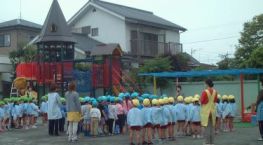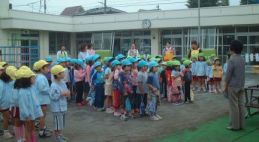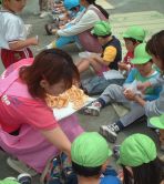 | 保育園のバスに乗って、チヶ瀬第一保育園に行きました。園庭でみんな揃ってお話を聞きました。 |