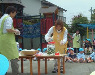 ぞう組の先生が梅ジュース作りに挑戦。 先生、頑張って・・・ |
