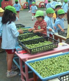 | 先生が落としてくれた梅の実を運ぶ人。それを洗う人、洗った実を干すところまで運ぶ人。 |