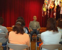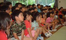 むかし、むかし あるところに、 おじいさんとおばあさんがいました・・・・ おじいちゃん先生が、「桃太郎」の お話をしてくださいました。 先生は永年 園長先生をしていて 退職後は、たくさんの保育園や幼稚園で 昔話をして歩いているそうです。 今まで、多くの子供たちが このお話を聞いておおきくなりました。 |