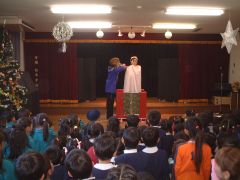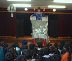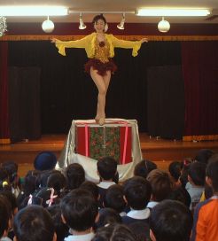 成木保育園のホールで千ヶ瀬第一保育園と駒木野保育園のお友達も 一緒に「渋谷慶太マジックファンタジア」のすばらしいマジックを見ました。 サンタクロースさんも一緒マジックを楽しみ、ビックリしていました。 |