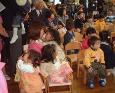 | 今年度もかわいいお友達がいっぱい入園してきました。入園式が始まります・ みんな、お椅子に座れたかな?? ![]() |