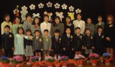 楽しかった保育園とも今日でお別れです。 今年度は10名の子供たち、先生手作りのお花を胸に、ちょっぴり緊張・・ |