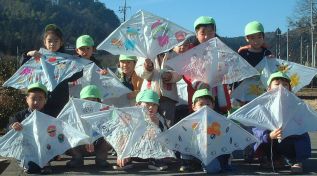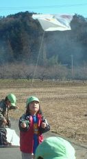 | 2003年1月10日 たこあげ大会をしました。 12月に保育園から、真っ白の凧を家に持って帰りました。 お正月の間に、お家の人と絵を書いて、たこあげの練習が宿題でした。 |