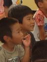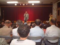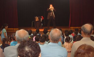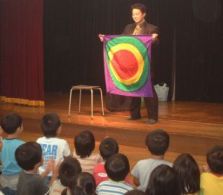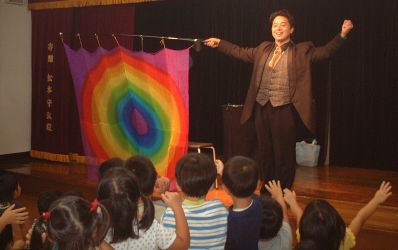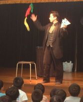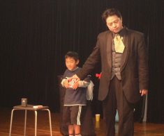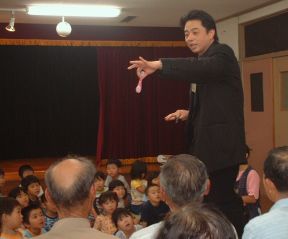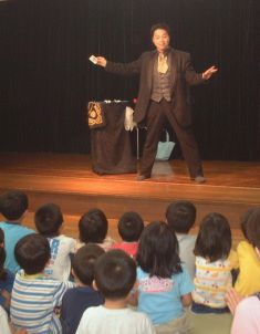 | 今年は、プロマジシャン藤本明義さんにお願いしました。 カード(トランプ)が、次々と手から出てくるんだよ。どうして〜・・・ 口からも出てきたよ。 |