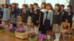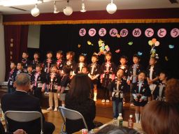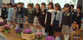 楽しかった保育園とも今日でお別れです。 22名の子供たち、先生手作りのお花を胸に、ちょっぴり緊張・・ |