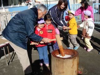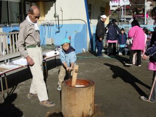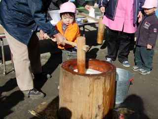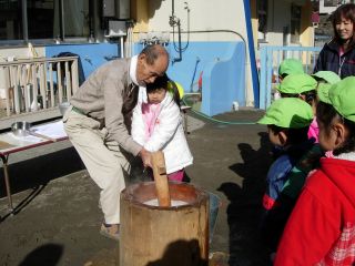 | 高齢者クラブの会長さんやおじいちゃん、おばあちゃん 保育園の理事監事のおじさんたち、 そして、保護者会の役員さん、有志のお父さん。 みんなでお餅つき |