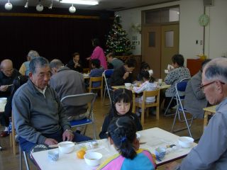 | 今年から、各クラスでお食事です。 ぞう組はホールで高齢者クラブの方と一緒。 小さいクラスは保護者会の役員さんたちと一緒。 今年もいろいろな交流事業をしました。いろいろな経験が出来ました。 2006年1月には、まゆだまつくりを教えていただくことになっています。楽しみです。 |