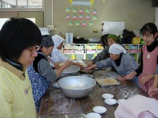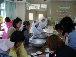 | 搗きあがると、今度はおばあちゃんたちが保護者会の役員のお母さんたちに 大福もちの作り方を教えてくれます。 出来上がりをみると、・・・・・・なかなか難しい。 |