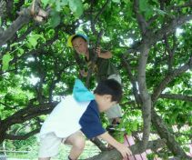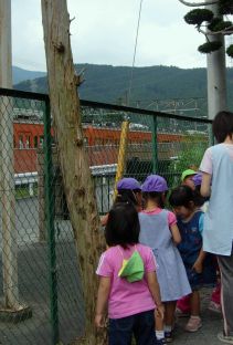 | 園庭には、きゅうりやナス、木陰や登れる木もあって、珍しい遊具もいっぱい そして、なんたって電車が見える。 |
