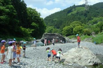 | 成木保育園の前も川があるけど・・多摩川はスケールが違う。 思い切り、石を投げたり。 あっカヌーが・・・どこまで行くのぉ、気持ちよさそう。 |