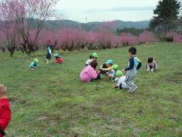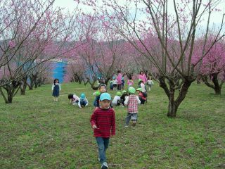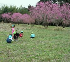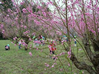 | 桃の花を通り抜けると、広い草原、そしてそこからは埼玉県飯能市の小学校が見えました。 東京都と埼玉県の境です。 内緒の話だけど、園長先生が小さいころは、ここで男の子たちが埼玉対東京の戦いをしたって。 戦場ヶ原!!?? うそ、ほんと? それより、卒園したAちゃんや、Yちゃんが行ってる学校だよね〜。こんなに近いんだ。 |