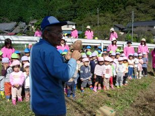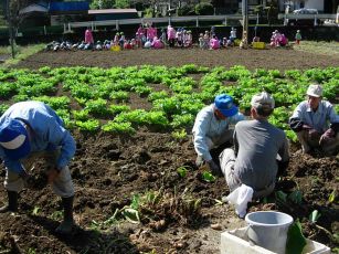 | こちらのおじいちゃんはサトイモを・・・後ろは子どもたちが蒔いた、聖護院大根です。 |