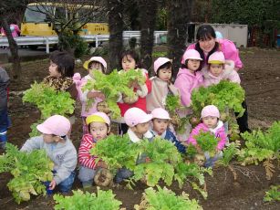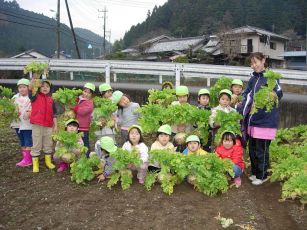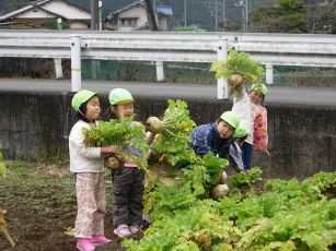 0歳児からみんなで畑に行きました。  おおきなカブのように大根を抜きました。