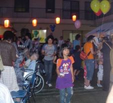 | 踊り終わるころ、あたりは暗くなり、 ホームで用意してくださった、金魚すくい、風船、スーパーボール 焼きそば、たこ焼き、カキ氷、フランクフルトなどなど数種類。 食べ過ぎないようにお楽しみ券引き換えで、いただきました。 |