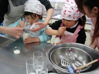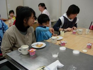 | まず、初めてのバターつくりに挑戦です。 こんなに簡単にできるなんて、お母さんたちも大発見。 |