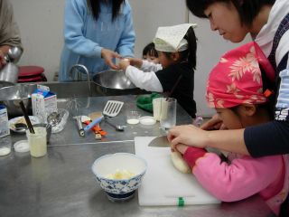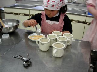 | 成木市民センターの調理室で お料理教室をしました。 栄養士さんが、牛さんのこと、牛乳のこと、 チーズのこと、バターのこと いろいろにお話をしてくれました。 |