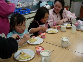 | パンケーキがこんがりと焼けて、手作りバターをのせました。きな粉ミルクと一緒に「いただきまーす」 | |