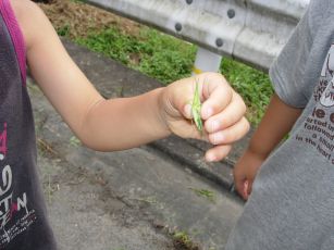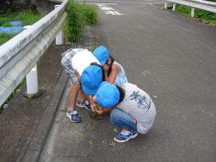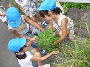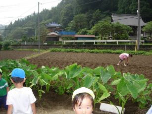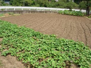 | 畑にはサツマイモと八つ頭の葉っぱが 大きく育っています。土の下のお芋も大きいかな? 秋が楽しみです。 |