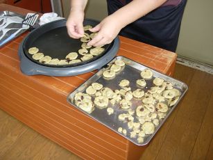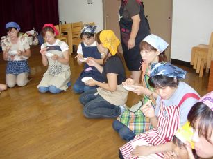 | 手で丸めてぺちゃんこにしたり 型で抜いたり、 ポットプレートで焼きました。 とっても良い匂いがしてきました。 おかあさんも一緒にいただきます |