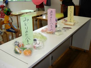 | きいろの食べ物 あかの食べ物 みどりの食べ物 さて、裏返しになっている食べ物カードを それぞれの場所にお母さんと一緒に置きます。 |