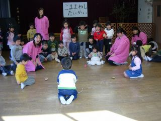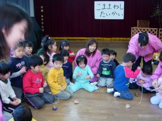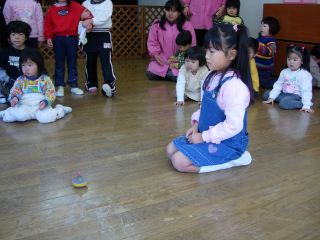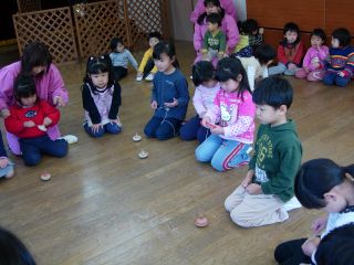 | 平成18年1月11日 コマまわし大会をしました。 昨年の暮れに、白木のコマを子ども達に渡し、 お正月の間に、お家の方と一緒きれいにしあげて、まわす練習もしてきました。 |