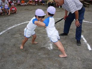 | みんな、結構気合が入っています。 押し相撲だけでなく、わざをかける子もいました。 |