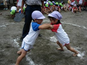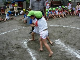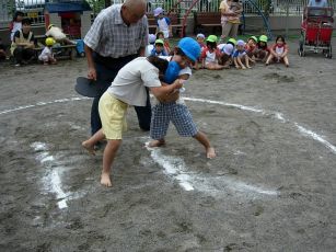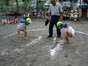 | 今年も夏の終わりの行事 相撲大会をしました。 以前は成木2丁目の諏訪神社で行なう相撲大会に 参加していましたが、今はその相撲大会が 開催されなくなって、保育園だけで行なっています。 |