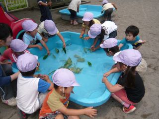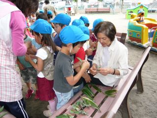 | 笹をとって来て、笹船を教えてもらいました。 水に浮かべると、船が進みました。 |