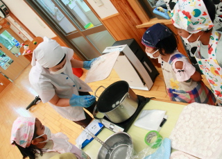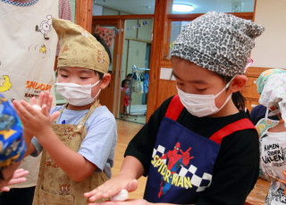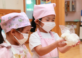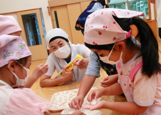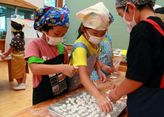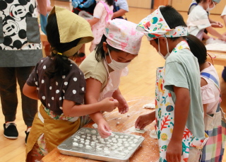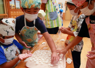 2025/9/25 調理保育 (月見団子作り) きりん組とぞう組は調理保育として、 月見団子作りをしました。 給食の先生が粉と水をいれて、 みんなで揉みこみました。 生地を手で丸くして平らにして、 五円玉の大きさの団子を作りました。 みんなで作った団子は給食室で茹でて おやつで食べました。