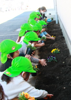 2025/11/14 花と球根植え 今日はぞう組・きりん組で、 ビオラとパンジーと球根植えを行いました。 花がさしてあるポットをもんで、 やさしく外して植えました。 そして、ぞう組がチューリップの球根を ビオラ・パンジーを避けて間に植えました。 植えた後はしっかりと水やりをしました。