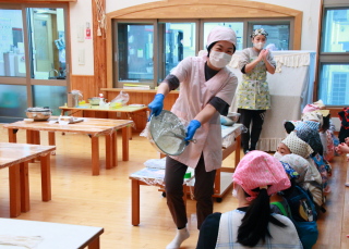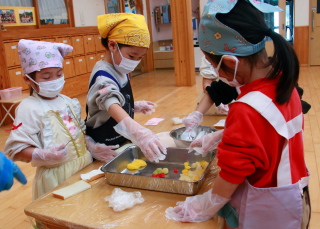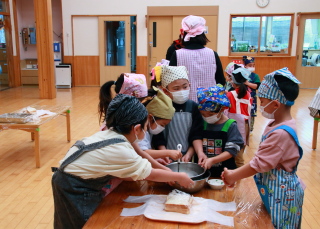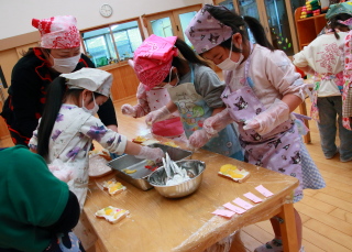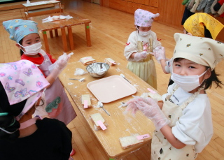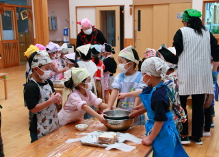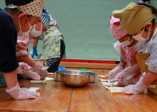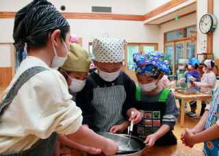 混ぜる園児と、ボールを押さえる園児と分担して作りました。