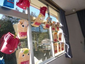 子どもたちが作ったお面が、ホールの窓につけられました。