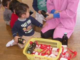 先生から豆をもらってもなんか、神妙な顔。 すでに男性保育士のS先生にしがみついて。