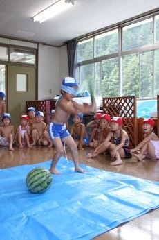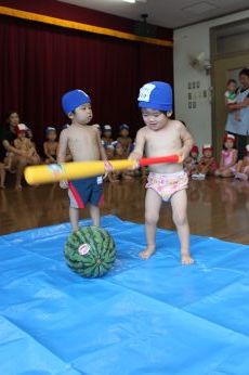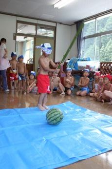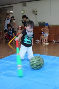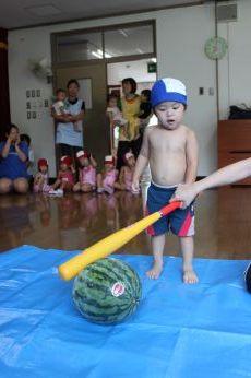 | 今日はプール納め ホールですいか割を楽しみました。 小さいお友達は、かわいいバットでコーン・・・ |