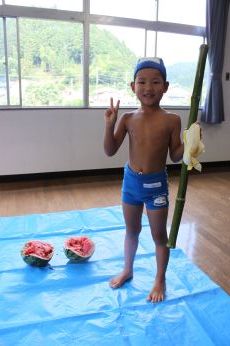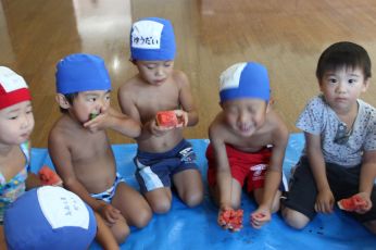 | みんなで食べるスイカは、とってもおいしかったです。 この後、最後のプール遊びを楽しみました。 |