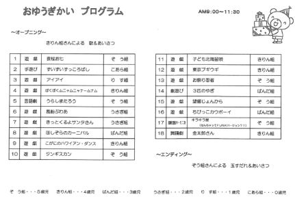 | 遊戯 アイアイ りす組 | 遊戯 ぽくぽくムニャムニャナーナムナム きりん組 | |||