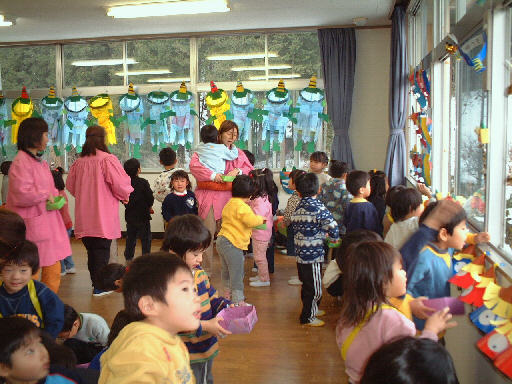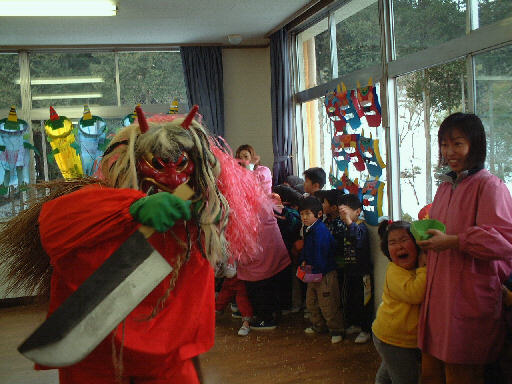 ちょっと、心配そうに、自分で作った鬼のお面に豆をまきました。