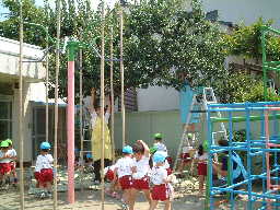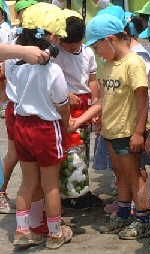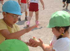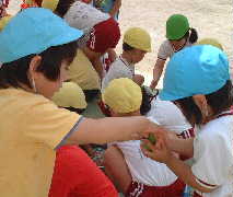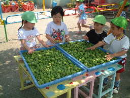 | 大きいクラスのお友達が、梅の実を洗ってくれます。 「干して置くところまで運んでね・・・落とさないでね。しっかり持ってね・・」「わかった。」 |