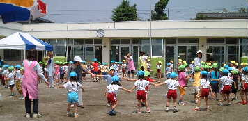 | おやつをいただいて、外でみんなでフォークダンス。 初めて踊った曲だったけど、とっても面白かったよ。。 |