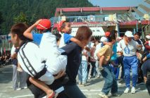 きりん ぞう組親子の突撃!!おんぶ騎馬戦 お父さんやお母さんの背中に乗って帽子の 取り合いです。 すごい迫力。子供たちもおんぶしてもらって うれしそう!! |