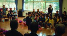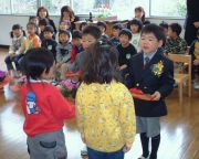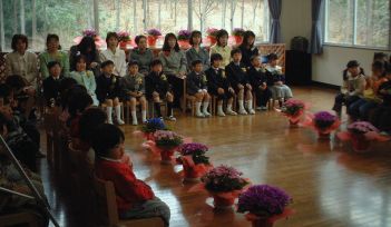 楽しかった保育園とも今日でお別れです。 今年度は10名の子供たち、先生手作りのお花を胸に、ちょっぴり緊張・・ |