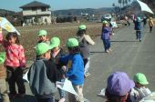 | 風がなく暖かな日になりました。 保育園のバスに乗って、3丁目の安全な農道に行きました。 本当は少し風があるほうがいいのだけれど・・・・・・・・・・・・ 田んぼにも入っていいよと言ったのですが、みんな道路で。 |