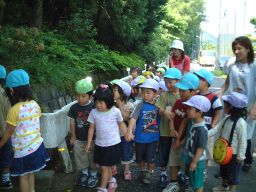 ぞ う組 「どこに行くのかなぁ」と昨日から楽しみにしていた園外保育。 バスに乗り2丁目グランドへ行きました。広いグランドを見て「お−ここならのびのび遊べそうだね。」と 言うK君。麦茶を飲んで休息した後は八雲神社の長い長い階段をのぼって一番上まで行きました。 たくさん歩いて疲れたようでお昼寝はみんなぐっすり眠りました。 |