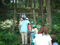 | きりん組 ぞう組さんとバスに乗って2丁目の中里グランドまで行き他のクラスが来るのを待っている間 グランドで遊びました。 女の子はつつじの花で頭を飾ることに熱中。 男の子は芝生の上で前転したり、ヒーローごっこをのびのびと楽しんでいました。 その後、八雲神社へ行きました。長い長い階段に「もうイヤだよ−」「疲れたよ−」と 弱音を吐いていた子も無事、頂上に到着。社の前で「お話の聞けるいい子になります。」と 約束してきました。帰り道、遠くの方から神様の声?や、狼の鳴き声?が聞こえどの子も ビクビクしながら降りてきました。 たくさん歩いてお腹が空いたのかみんなおかわりをたくさんしました。 |