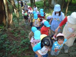 | うさぎ組 うさぎ組になり初めての「バスに乗ってのお出かけ!」 嬉しくて立ちあがる子、緊張してしまう子…。 2丁目のグランドに着きぞう組さんと手をつなぎ神社の階段を登りました。 優しいぞう組さんに手を引かれ、うさぎ組の皆もニッコリ。 帰りのバスでは、「また、 行きたいね!」という声が聞こえてきました。 |