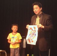 | 今年は、プロマジシャン藤本明義さんにお願いしました。 カード(トランプ)が、次々と手から出てくるんだよ。どうして〜・・・ 口からも出てきたよ。 |