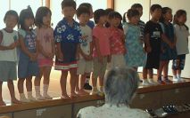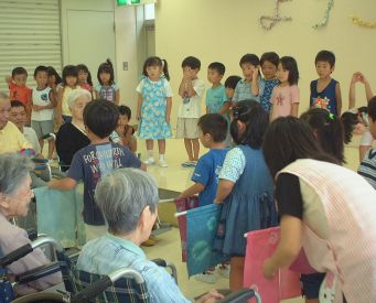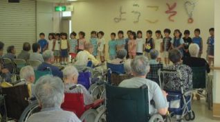 | 最初はあゆみえんに行きました。 ちょっと早い時間なので、おじいちゃんやおばあちゃんがいらっしゃるまで待っていました。 みんなで歌を歌いました。 |